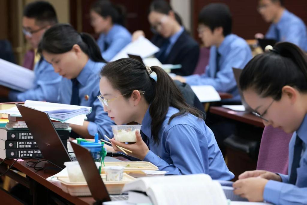 正午时分,赛场热度不减。工作人员悄悄将简餐送进两个考场,选手们匆匆用餐后继续投入战斗,有的选手眉头紧锁,仔细推敲证据链的完整性;有的选手指尖飞舞,快速撰写法律文书;有的选手凝神静思,深入剖析法律适用难题;有的选手不时翻阅资料,确保每个观点都有法可依、有据可循。