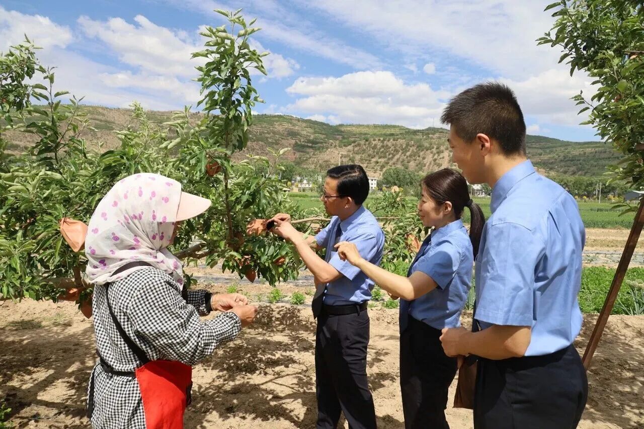 2025年6月3日,静宁县检察院干警就农业固体废物回收处理与果农在田间交流。