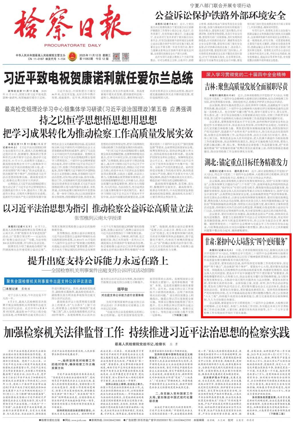 2025年11月12日,检察日报头版刊发《甘肃:紧扣中心大局落实“四个更好服务”》。