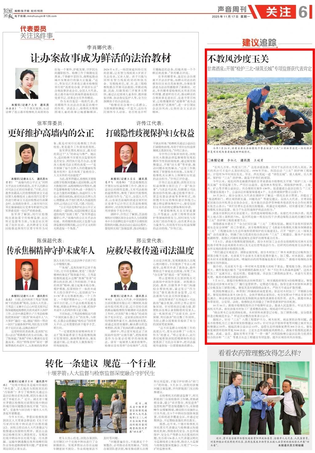 2025年11月17日,检察日报声音周刊刊发《不教风沙度玉关 甘肃酒泉:开展“检护三北·绿筑长城”专项监督获代表肯定》。