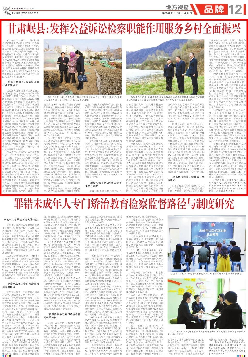 2025年11月13日,检察日报地方视窗刊发《甘肃岷县:发挥公益诉讼检察职能作用服务乡村全面振兴》。