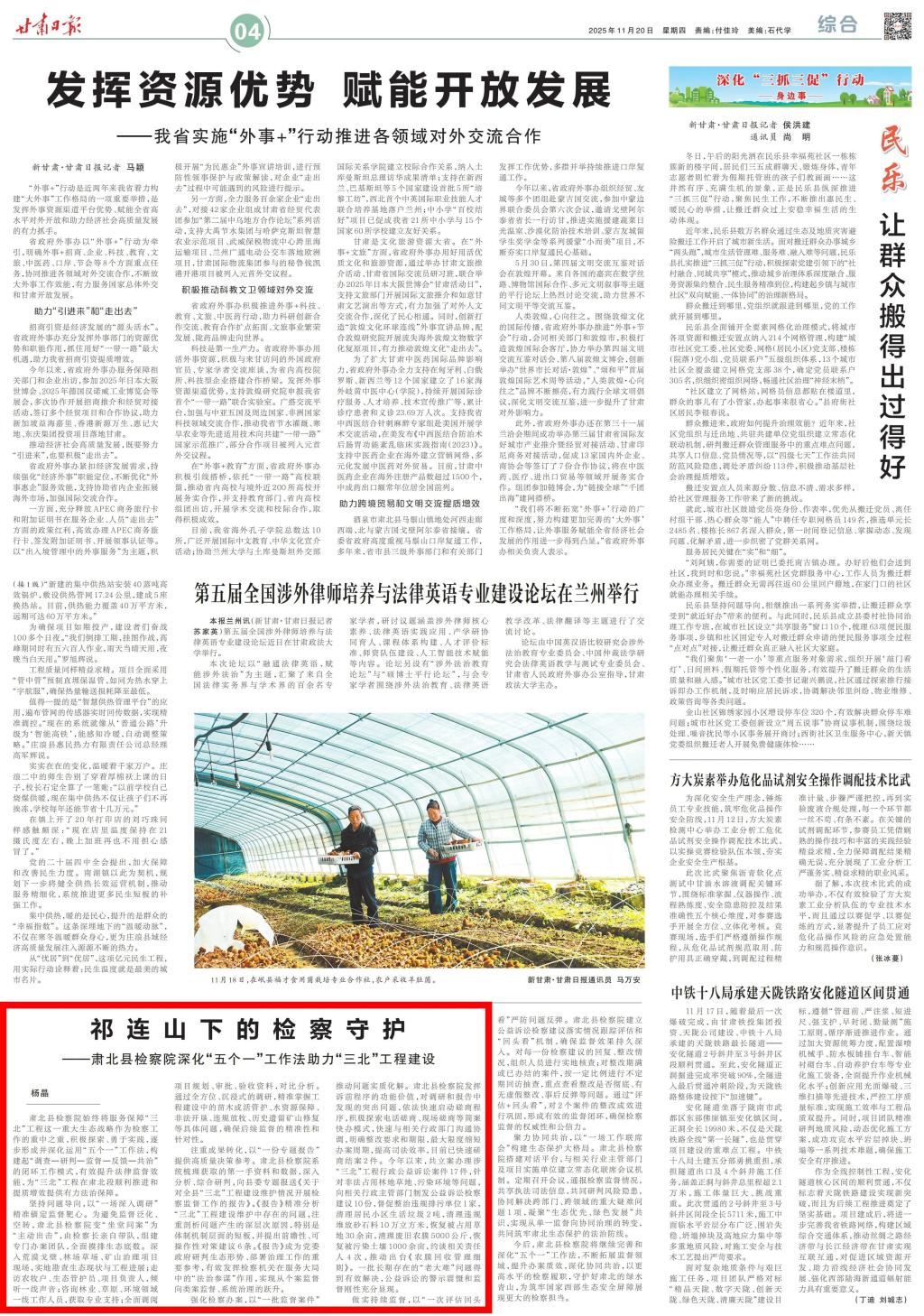 2025年11月20日,甘肃日报刊发《祁连山下的检察守护——肃北县检察院深化“五个一”工作法助力“三北”工程建设》。