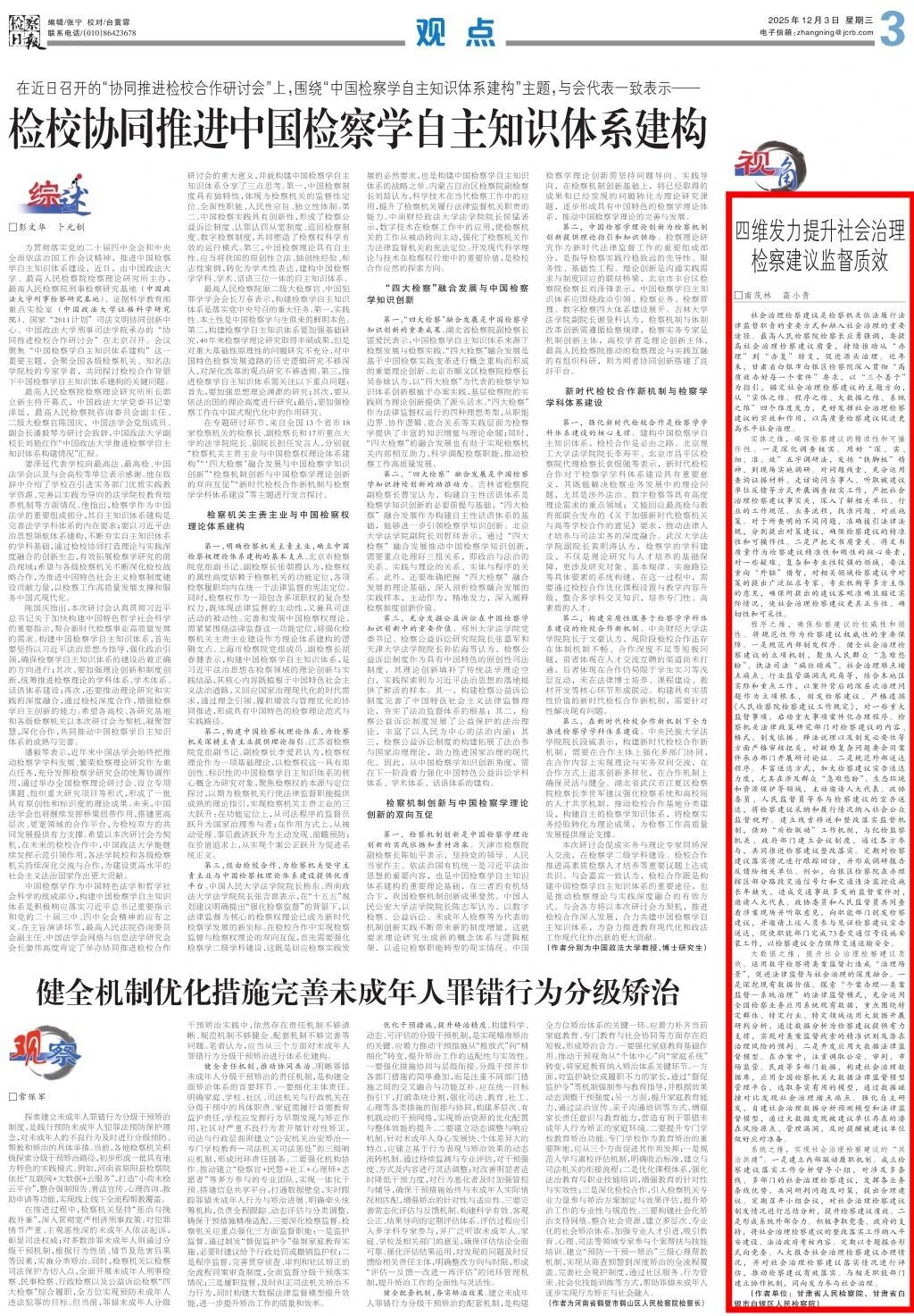 2025年12月3日,检察日报刊发《四维发力提升社会治理检察建议监督质效》。