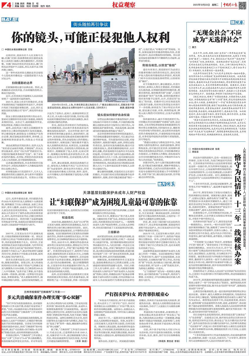 2025年12月23日,中国妇女报刊发《兰州市检察院“兰枫春煦”工作室——多元共治确保案件办理实现“事心双解”》。