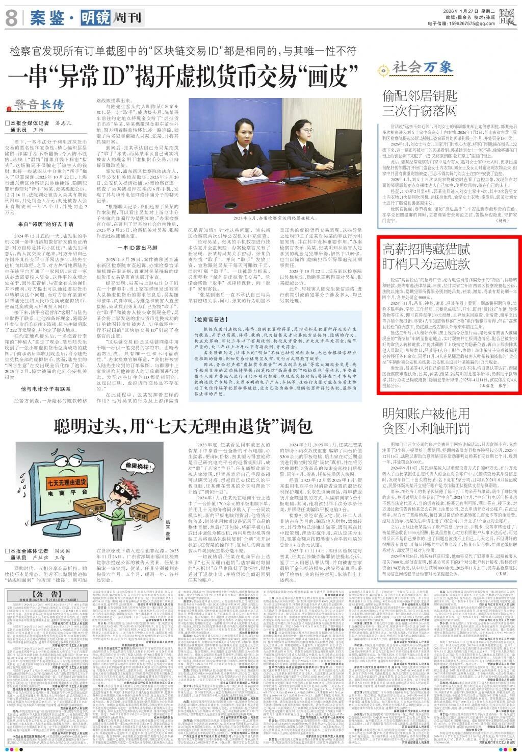 2026年1月27日,检察日报明镜周刊刊发《高薪招聘藏猫腻 盯梢只为运赃款》。