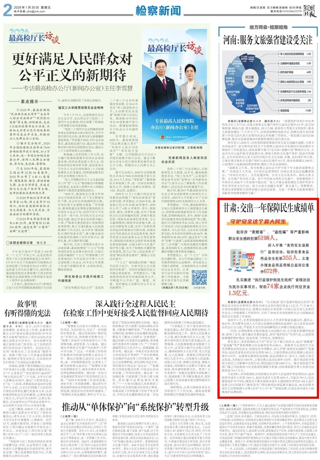 2026年1月30日,检察日报刊发《甘肃:交出一年保障民生成绩单》。