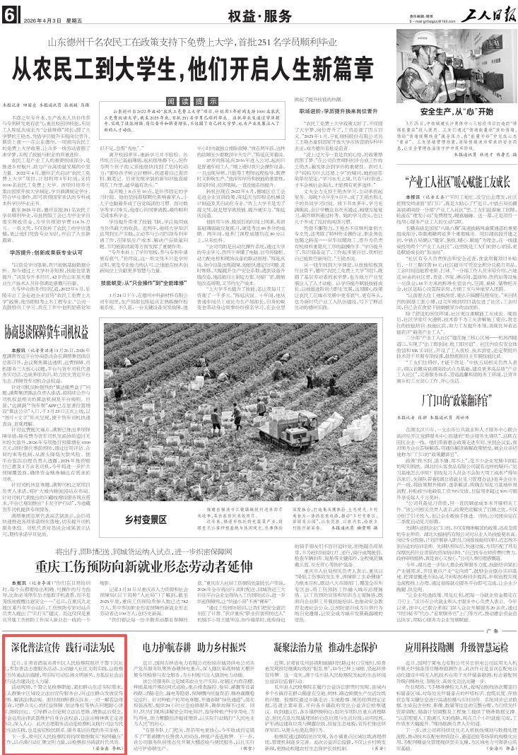 2026年4月3日,工人日报刊发《深化普法宣传 践行司法为民》。
