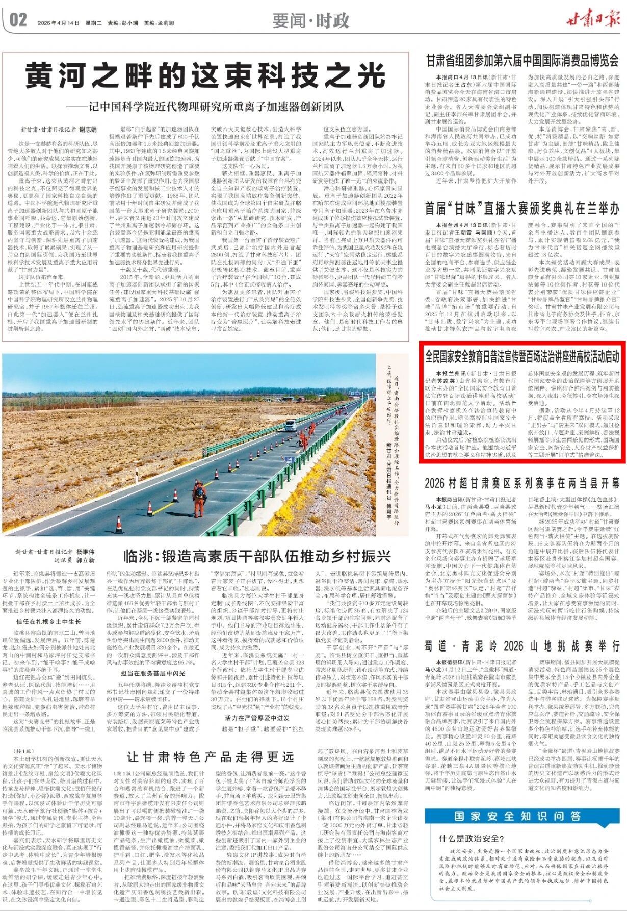 2026年4月14日,甘肃日报刊发《全民国家安全教育日普法宣传暨百场法治讲座进高校活动启动》。