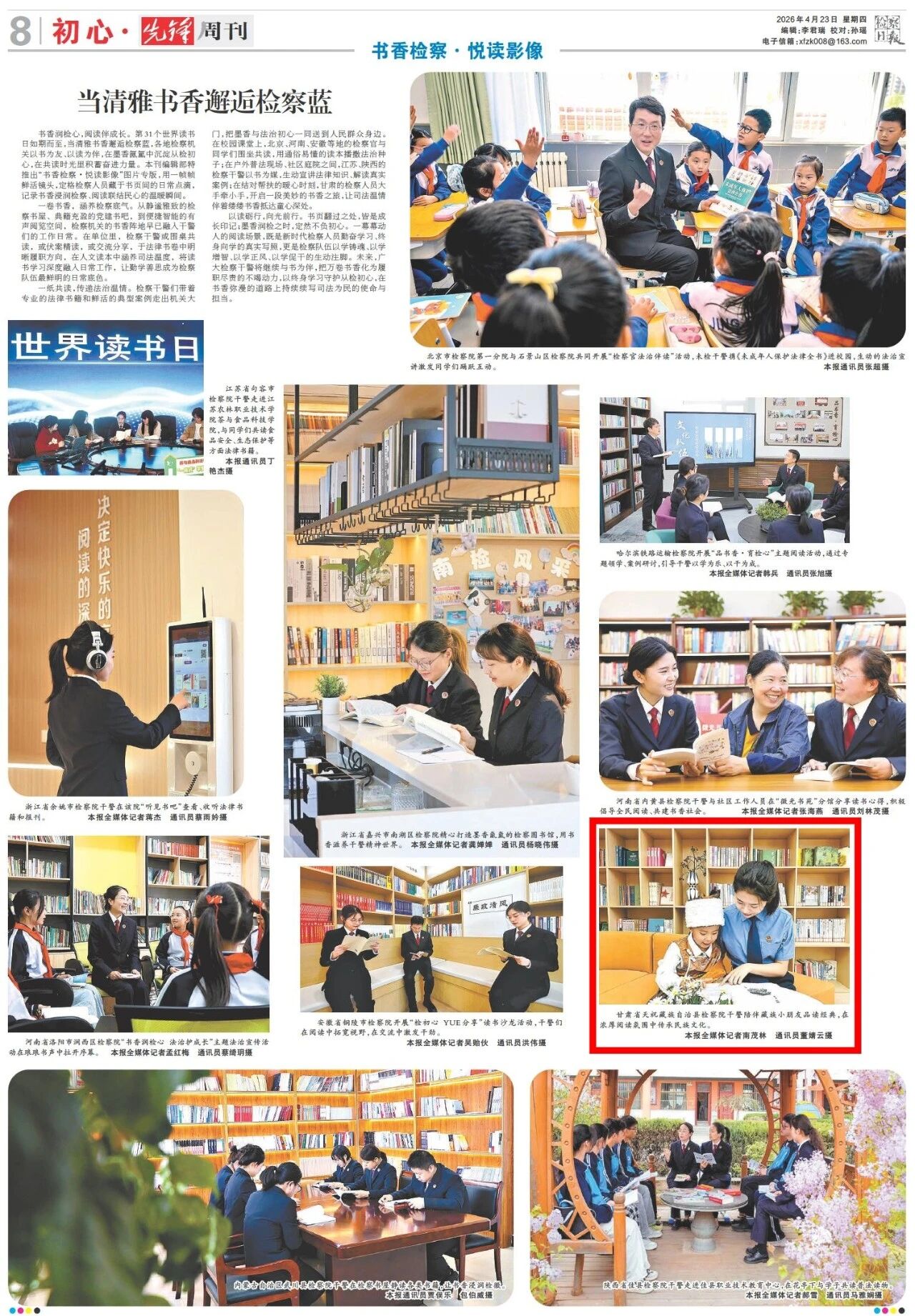 2026年4月23日,检察日报先锋周刊《书香检察·悦读影像》专版刊发甘肃省天祝藏族自治县检察院干警陪伴藏族小朋友品读经典的图片新闻。